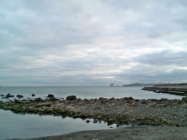 Ланжерон - Аркадия 10:00. Людей мало, пасмурно, без волн, прозрачная вода, судя по льду на лужах слабый "-". Лёгкий ветерок бодрит.