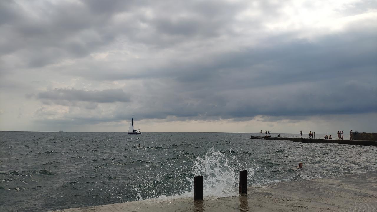 Море не спокойное но тёплое. Слышны раскаты грома со стороны Фонтана. Людей не много. А те кто есть начинают собираться.