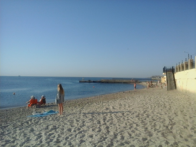 Только с моря. Вода гладкая, прозрачная, погуляли по волнорезу, ферринка не боялась прямо стайками через нас плавала. Рыбаки на пирсе пытаются что-то ловить- не сильно у них выходит. Людей немного, такое впечатление что приезжие свалили и остались местные. Вобщем отличненько все! ( Я даже немного подмерзла когда с моря выходила, в воде теплее чем на воздухе)