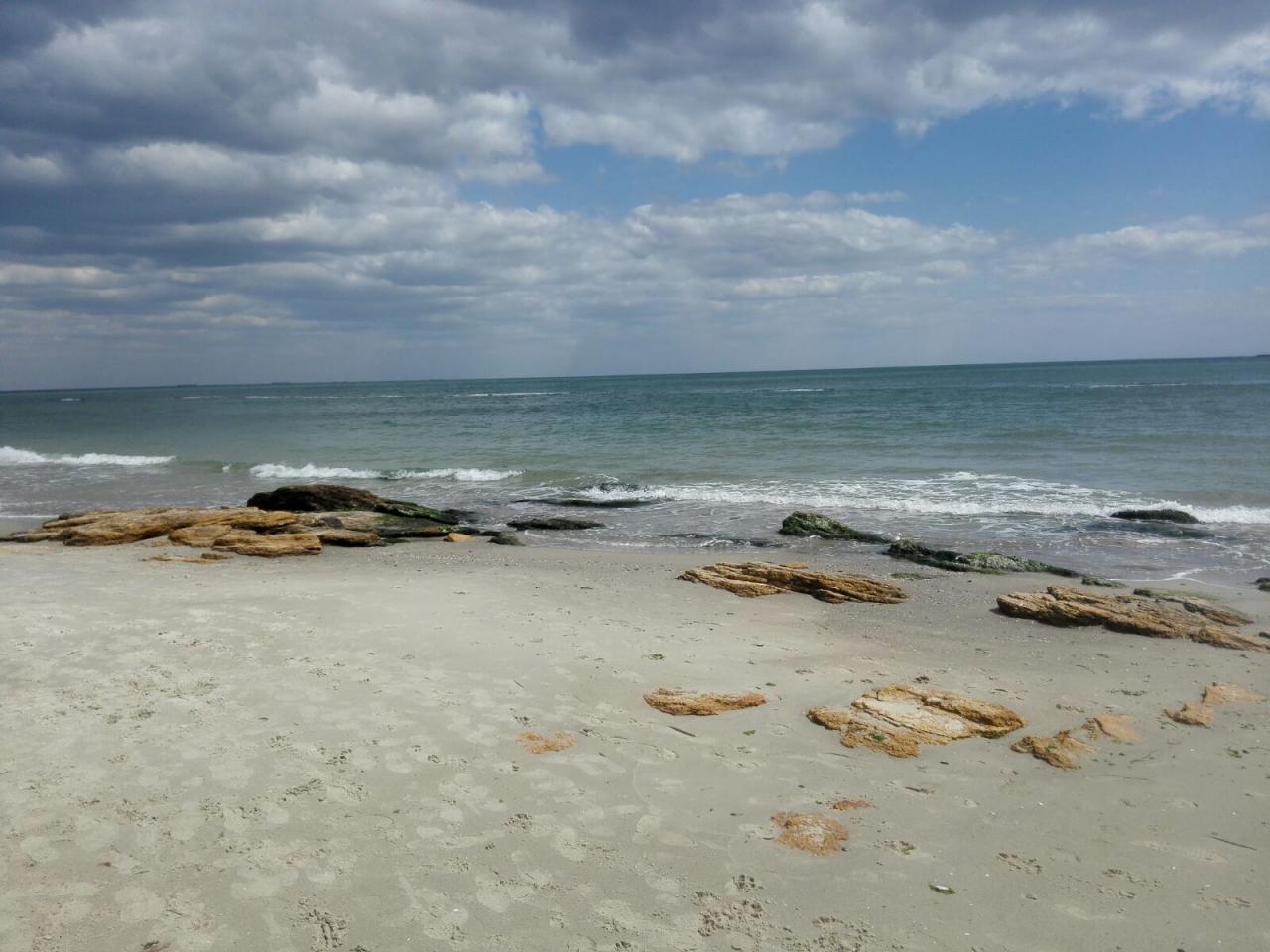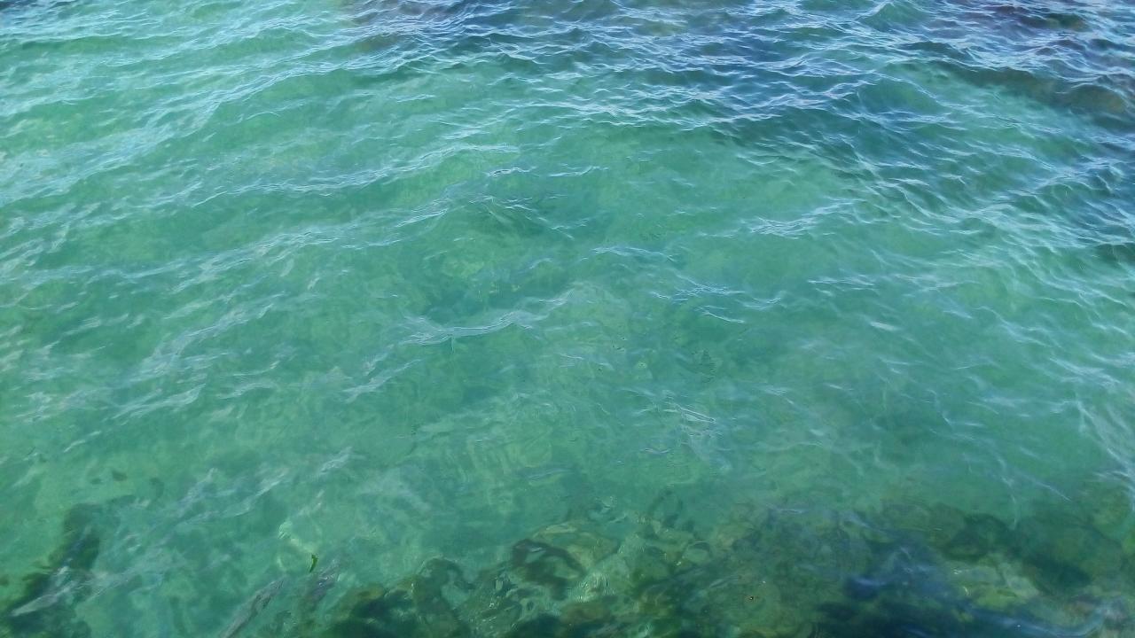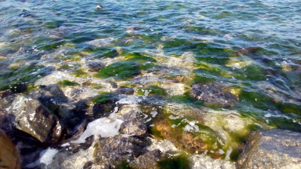 Море абсолютно спокойное, вода прозрачная и соленая. На дне много водорослей. И похоже на отлив, воды немного не хватает...