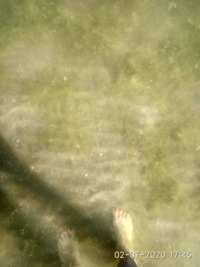 Вода чистая и теплая. Водорослей не много, взвесь в воде. Волны почти нет, рябь.