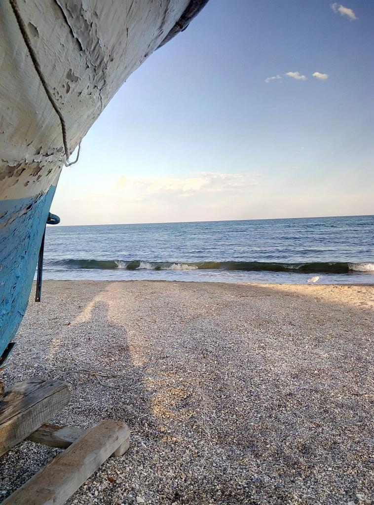 Когда солнышко прячется, море непрозрачное и мрачное становится. Только плавал в приятной голубой водичке и тут бац! -в абсолютно черной. Ветерок вечером уже прохладный, песок в тени вообще холодный. А в воде еще тепло и классно.