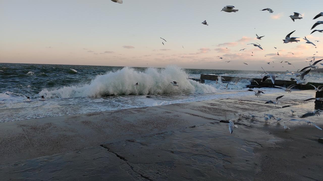 Дельфинарий. 15:30 красивые волны на фоне закатного неба. Очень много чаек и ха-ха) почти столько же фотографов