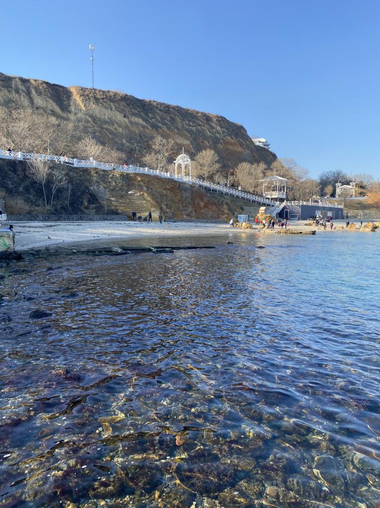 О 7.30 на плитах кабельного похмуро, вітру немає, на морі малюсеньки хвилі. Повітря 2, вода 4 градуси.