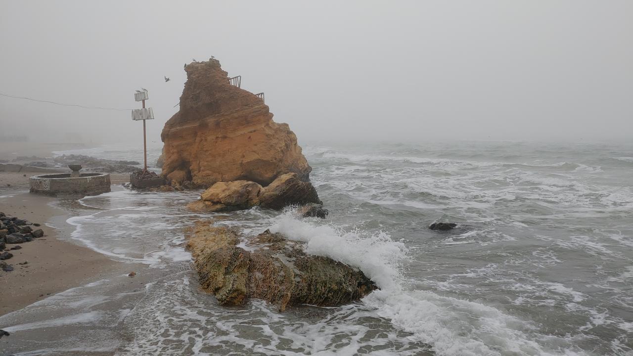 Жёлтый камень 8:15 волны. Море песок забрало, проявились камни, выше стали пирсы.