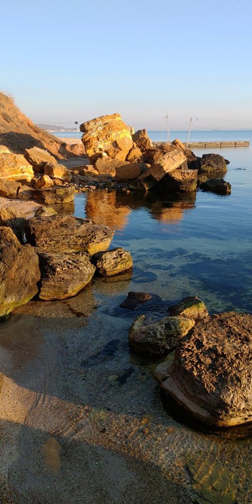Море сегодня спокойное, ну может ветровая рябь чуть сильнее обычного, вода прозрачная и соленая.