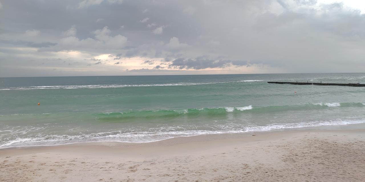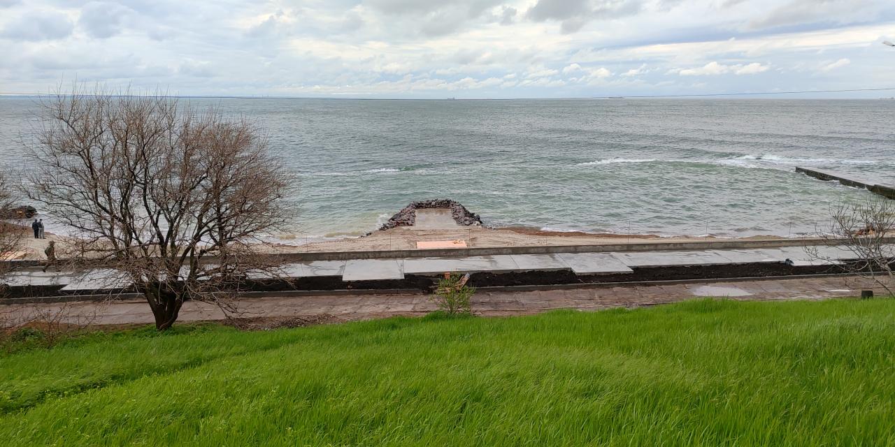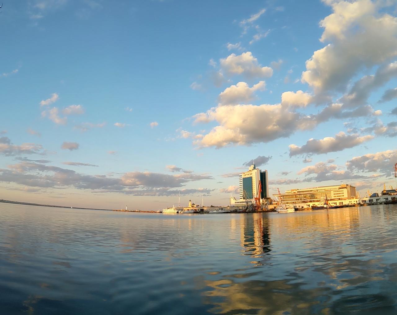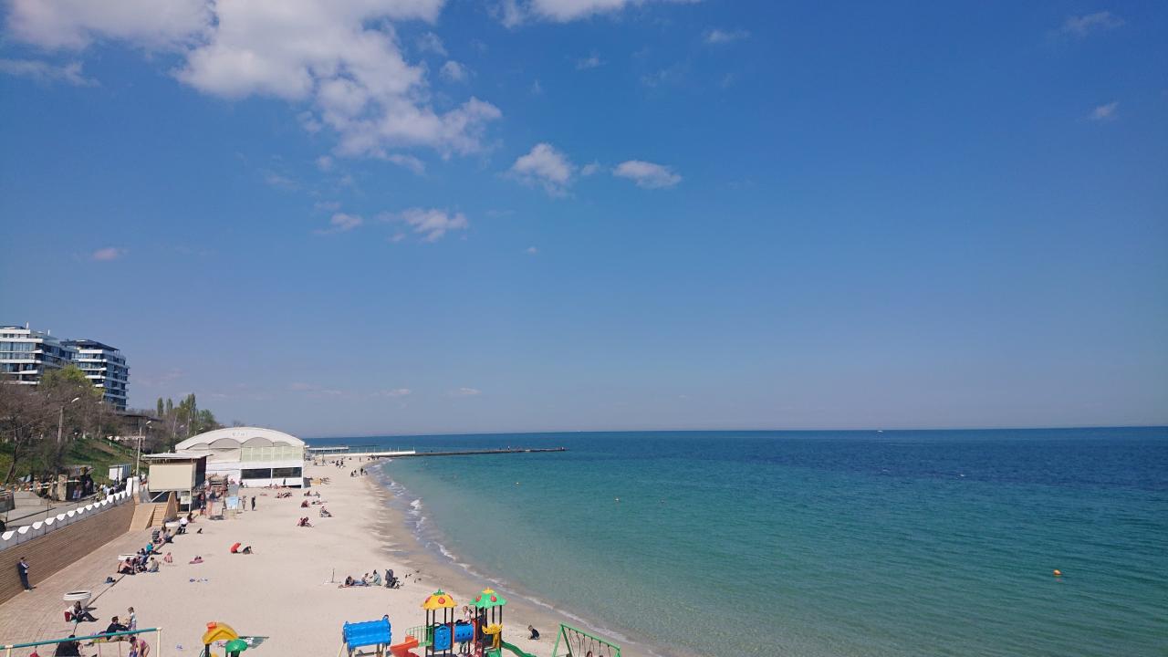 Сегодня от 13ой Фонтана до Ланжерона около 10:30 сразу после ливня. Море красочно зелёного цвета, на небе контрастируют белые облака на фоне серых туч, людей почти нет, воздух свежий-свежий. В Аркадии эффектно катались серфингисты.