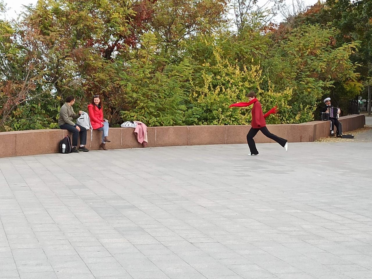 А на Суворовской аллее мужчина с красивым, бархатным голосом пел и аккомпанировал сам себе. А как душевно он благодарил за поддержку ден.знаками, находя слова для каждого. Я оглянулась вокруг и увидела улыбающихся людей. Все, словно сговорившись, подпевали и улыбались. И одна девушка очень здорово танцевала, усиливая эффект взмахами красного шарфа.