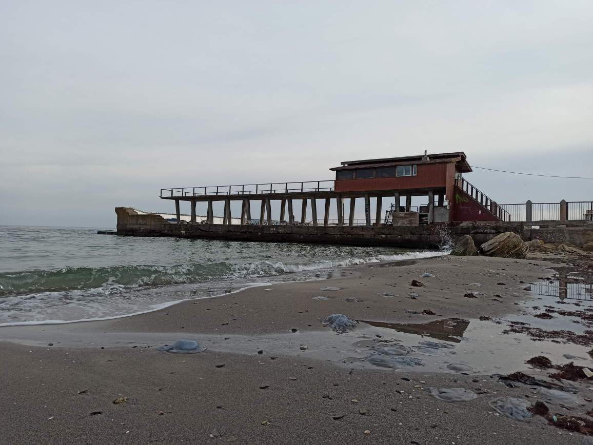 Кабельний о сьомій ранку. Похмуро, сонце лише на декілька хвилин вийшло з-за обрію і сховалося за хмари. Повітря майже немає, не морі невеличкі хвилі, вода непрозора. Повітря 10, вода 12.