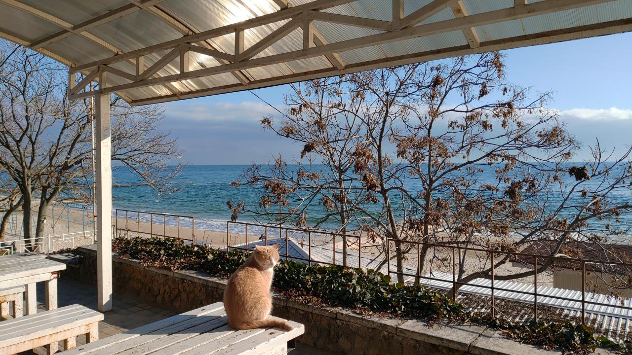 И галантный котик мечтательно глядит в сторону моря. Но у него работа, ответственность перед гостями заведения )