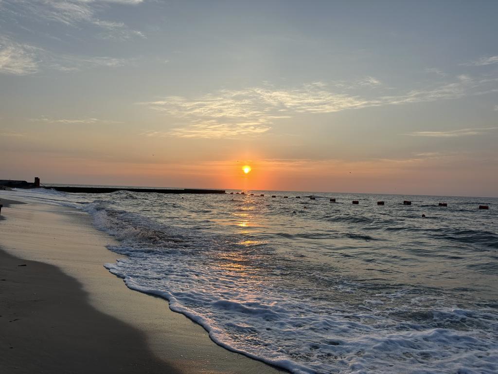 Пасмурно утром было, штиль почти... Вода тёплая, чистая, дно видно на волнорезе... Сейчас полный штиль![]()