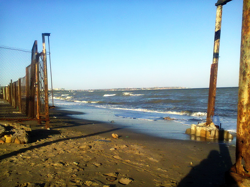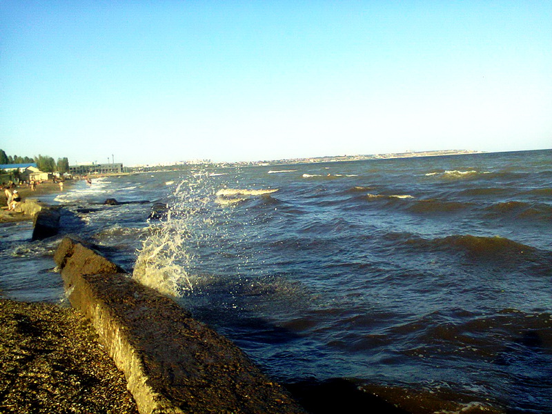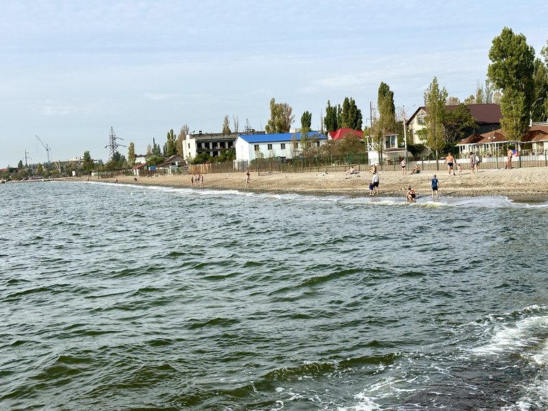 Кабельный оздоровительный центр, вдали два лебедя. Вода классная, не холодная, корнеротов нет, волны , у берега грязновая, но дальше чистая. Выходить из моря не холодно . Воздух вкусный и раскатистый шум волн .