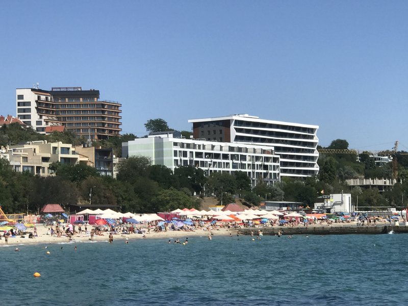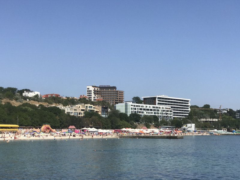 16я Фонтана. Вода теплая, полный штиль, абсолютно прозрачная. От волнореза видно дно. Полно живности: мелких медуз, огромные корнероты пасутся у волнореза, косяки рыб, крабы...