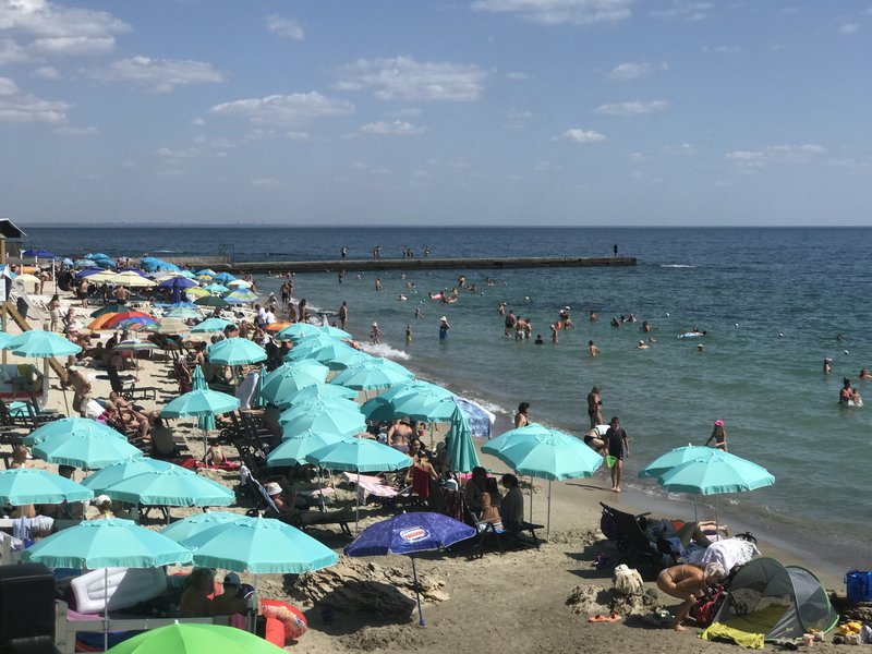 Отрада. Вода теплая, мутноватая, но чистая. Небольшие волны. Люди прибывают. А поглубже вообще прозрачная.