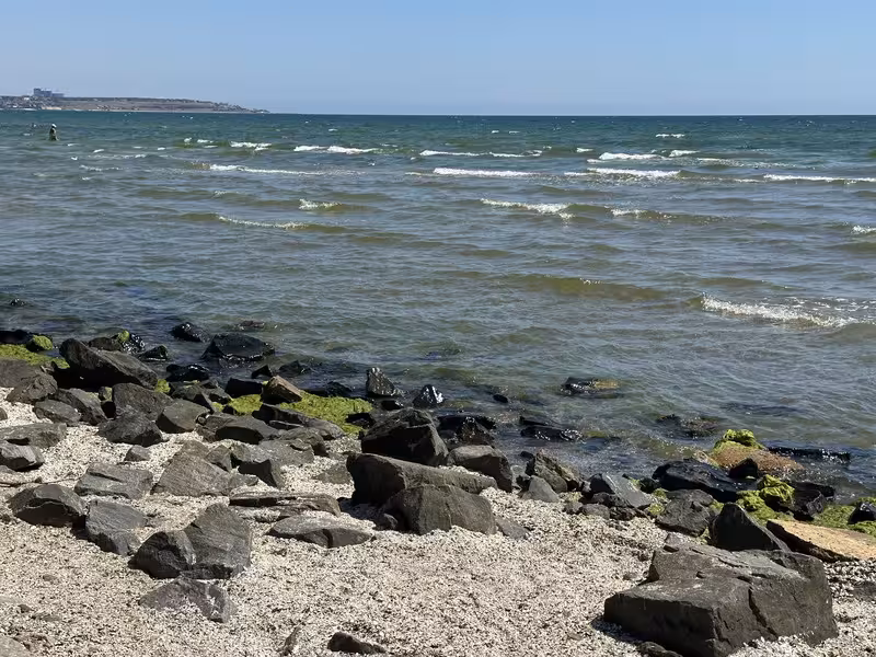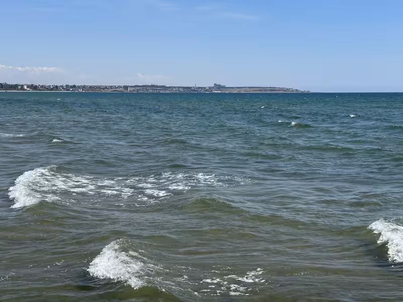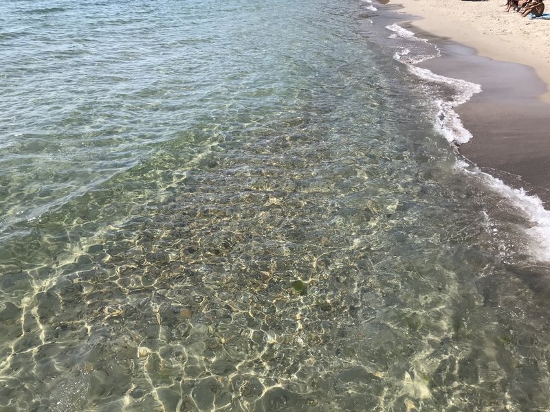 Вода не более 22°, медуз и водорослей нет. После обеда ветерок усилился, но не критично.