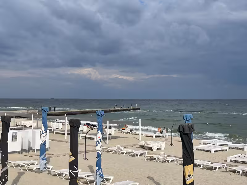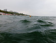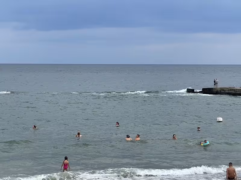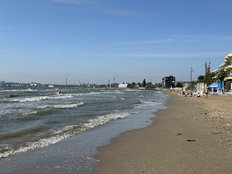 15 ст, людей много, рыбаки есть, не большой ветер с утра, море волнуется, вода градуса 22-23 мутная
