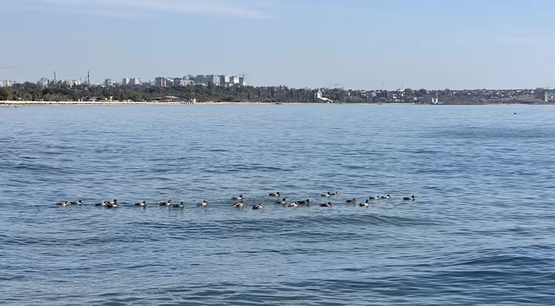 сегодня утром, интересно было наблюдать как утки сначала плавали кучкой , ныряли, что то ловили, а потом начали выравниваться в клин, потом выровнялись таки и уплыли