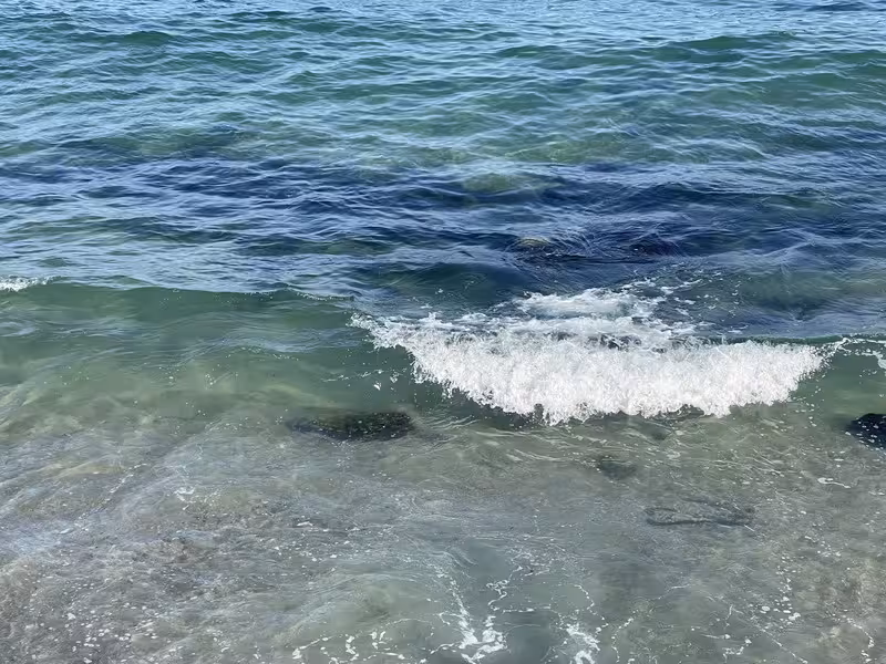 Море отъело часть берега, волны небольшие, прозрачность воды допустимая. Людей мало, как будто понедельник )