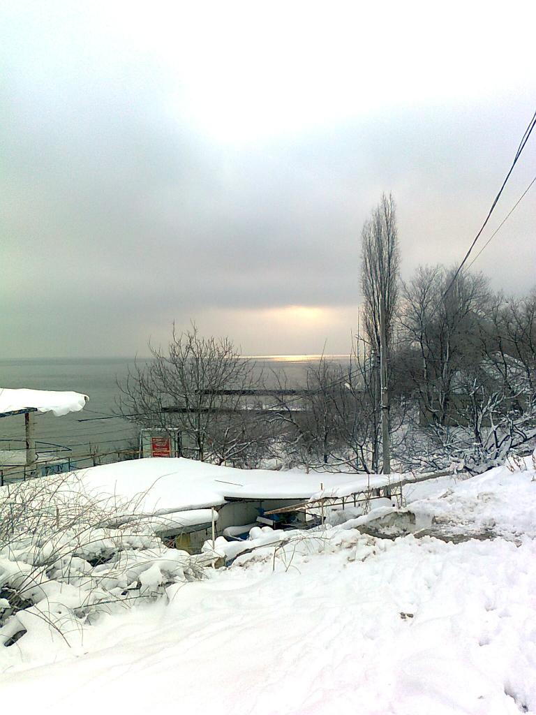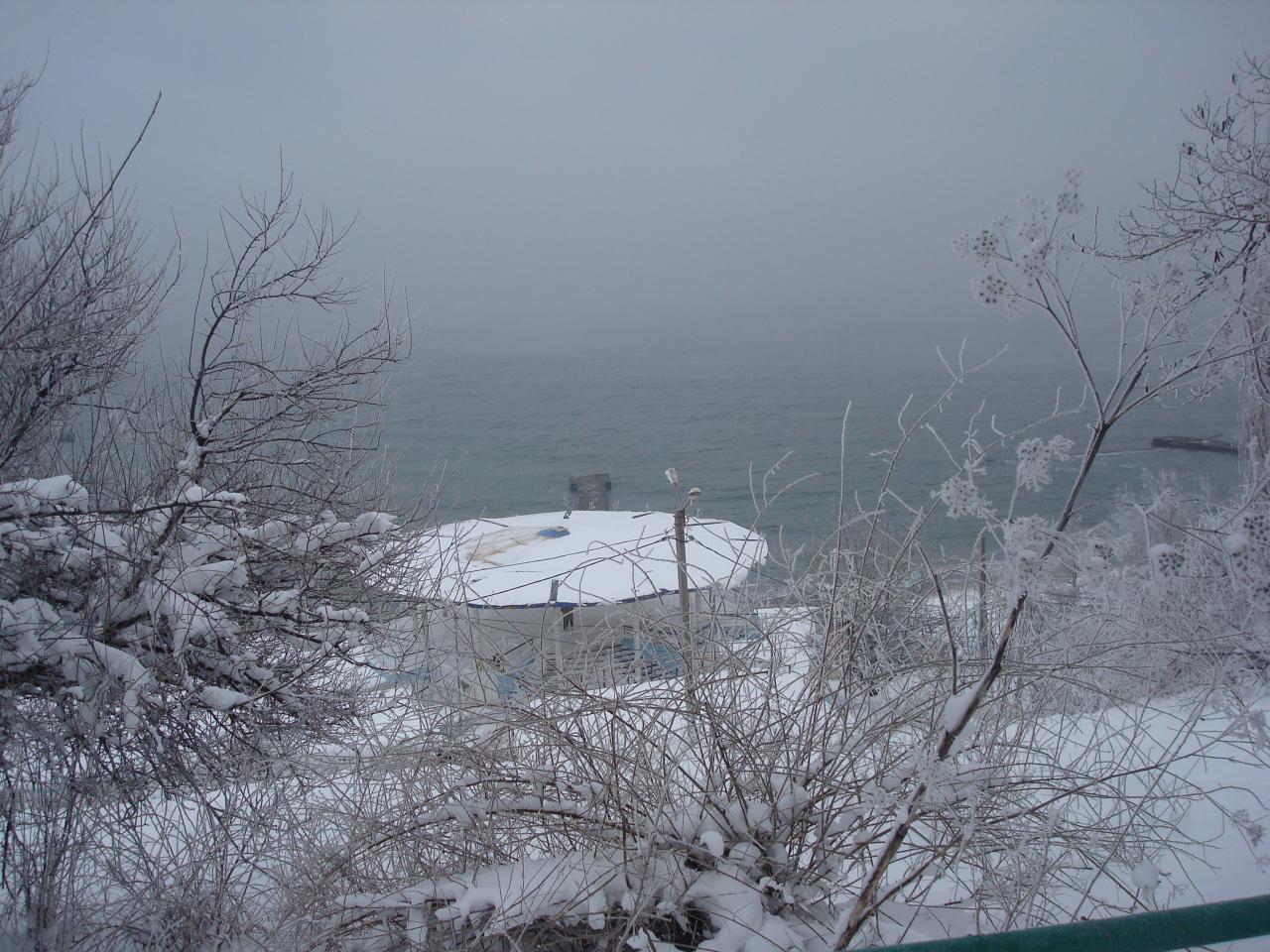 В бухтi тихо ,а за молом море трохи хвилюеться. Берег вкритий снiгом.