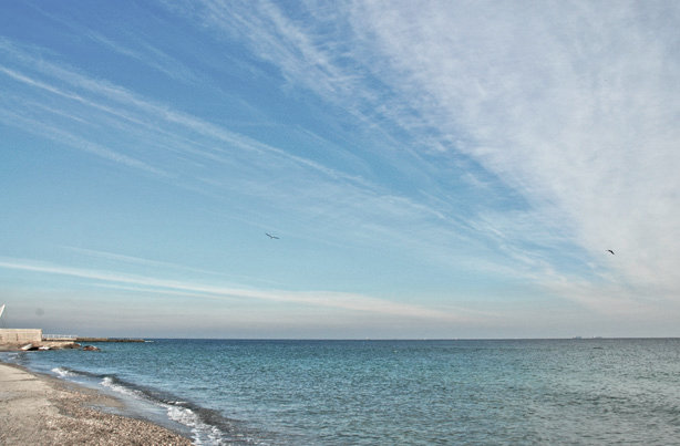 Вчера на море было просто здорово: не было ветра и небо было очень красивое.