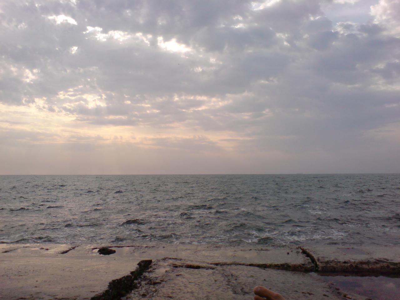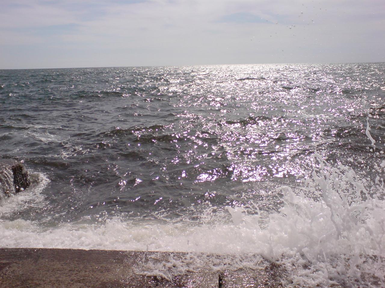 Сегодня ситуация получше: волны небольшие (20-30 см), водичка градусов 22-23, у берега опять водоросли, местами прямо заросли плавают: такие темно-зелёные с мелкими белыми ракушками- видать с пирса оторвало вчерашним штормом, но может и ошибаюсь, зато отойдя от берега метров на 10-15 абсолютно чистая и ПРОЗРАЧНАЯ вода! На глубине примерно 2м с поверхности видно дно с мельчайшими подробностями.