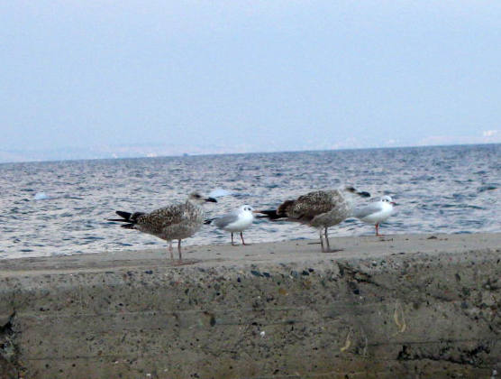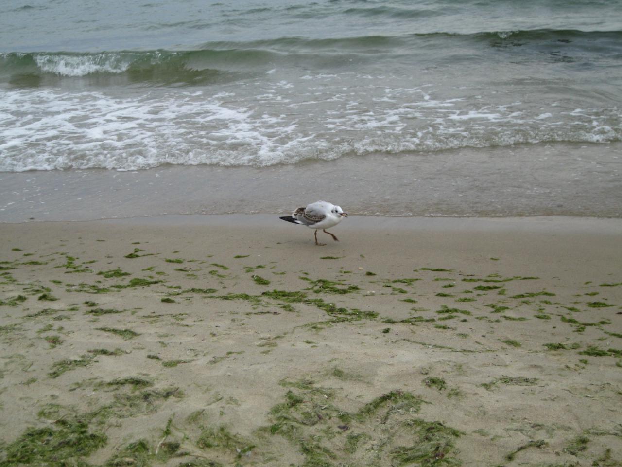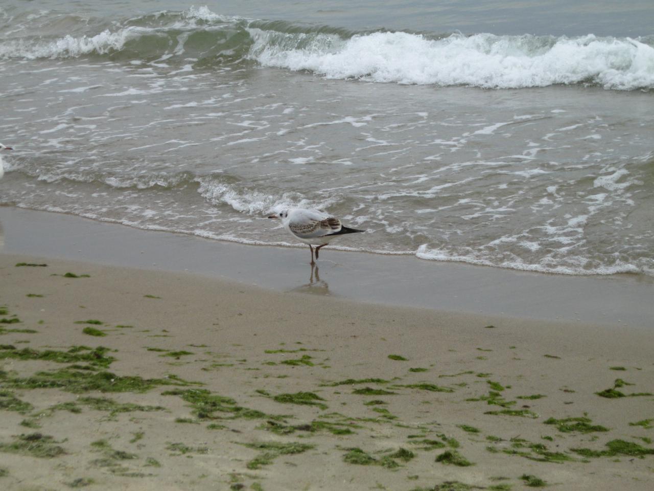 Много чаек на берегу, еще вороны, голуби, многие почему-то ели водоросли (отрывали куски и глотали). Одна из ворон пристала к чайке и с полчаса гоняла ее над пляжем. Мы уже ей кричали (чайке), чтобы села на воду, тогда ворона и отстанет, но она не слышала.