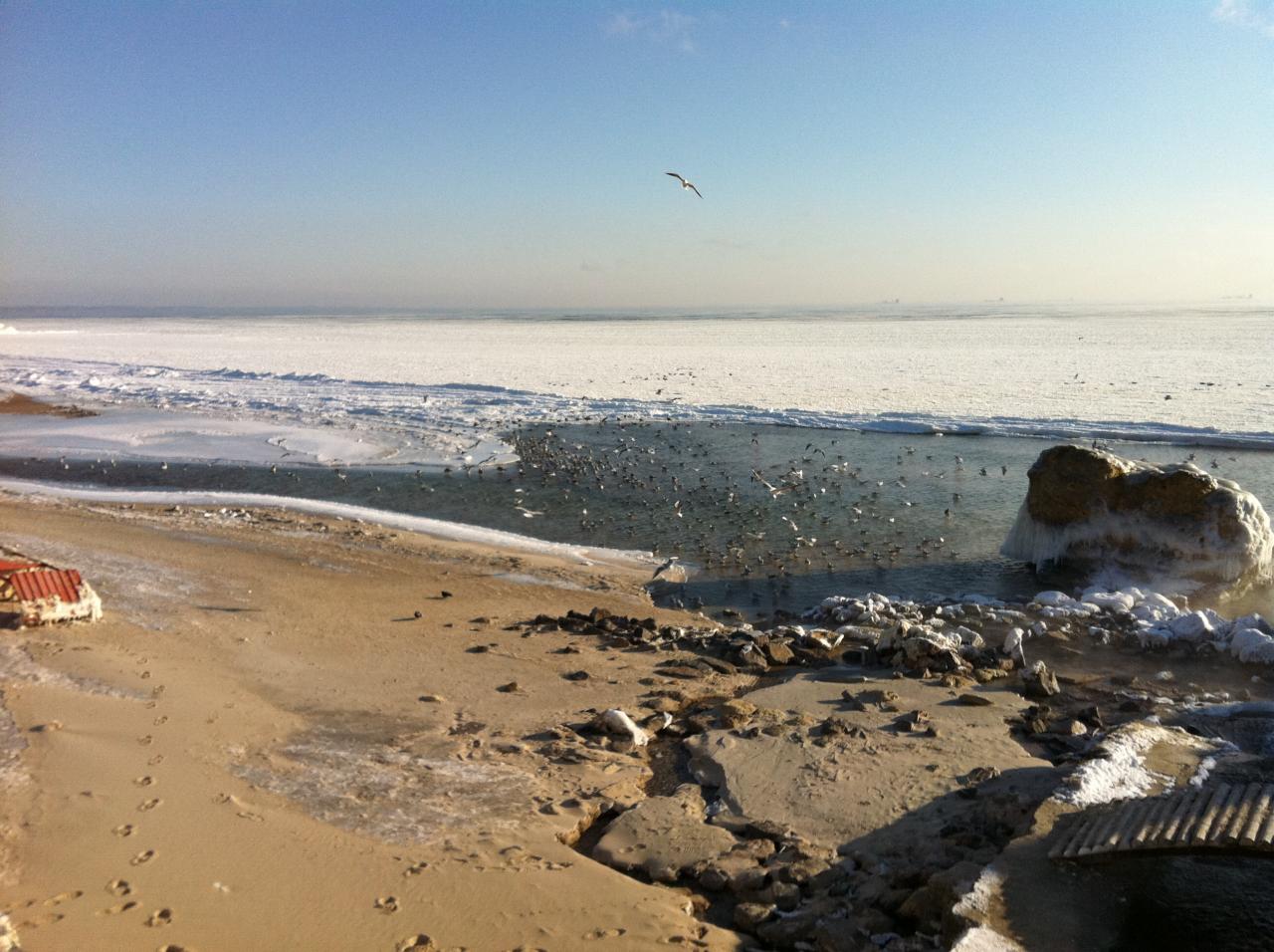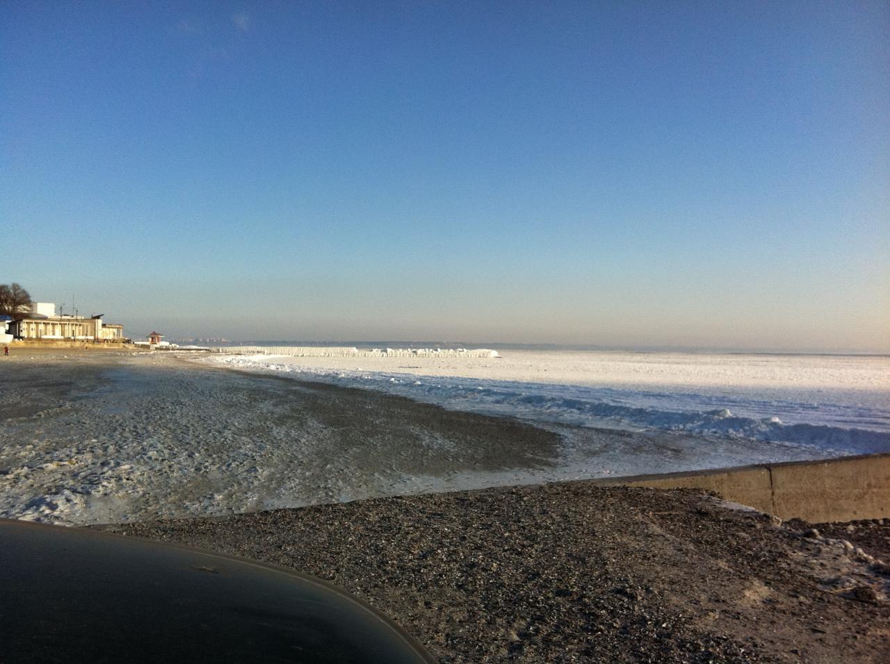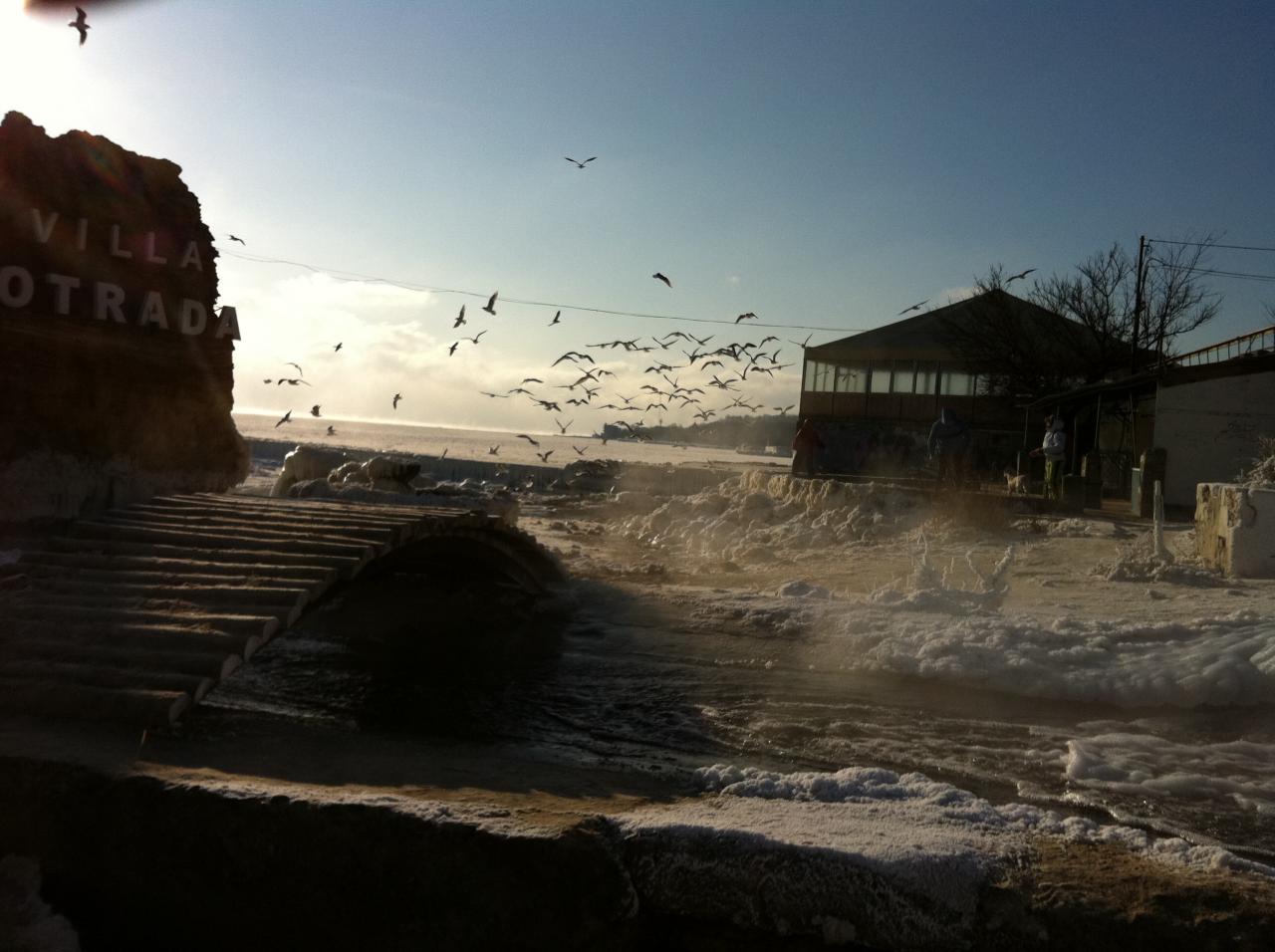 У дельфинария сегодня с утра. Море пока не замерзло, ледяная каша. Зато на пирсах и плитах пейзажи арктические.