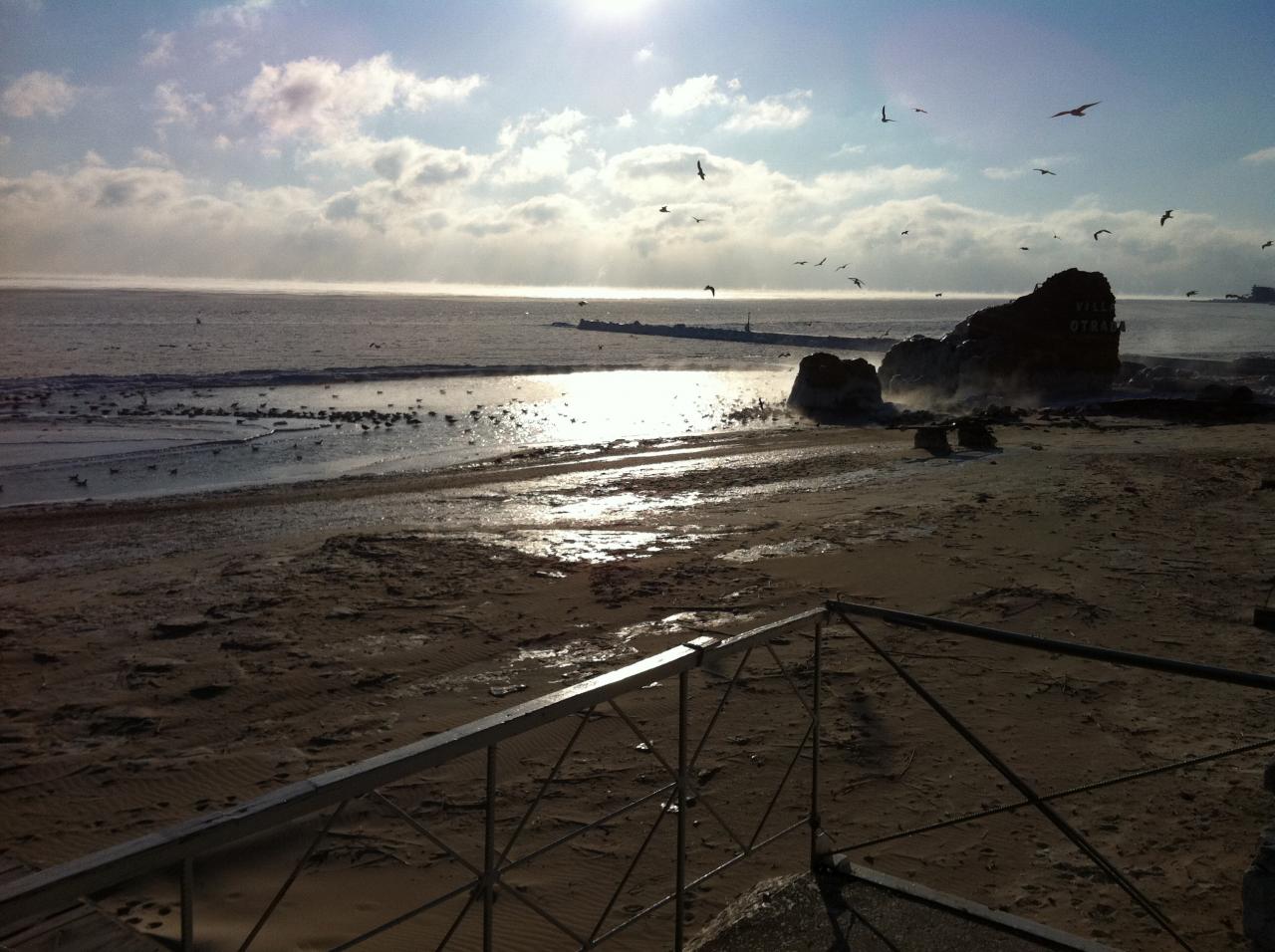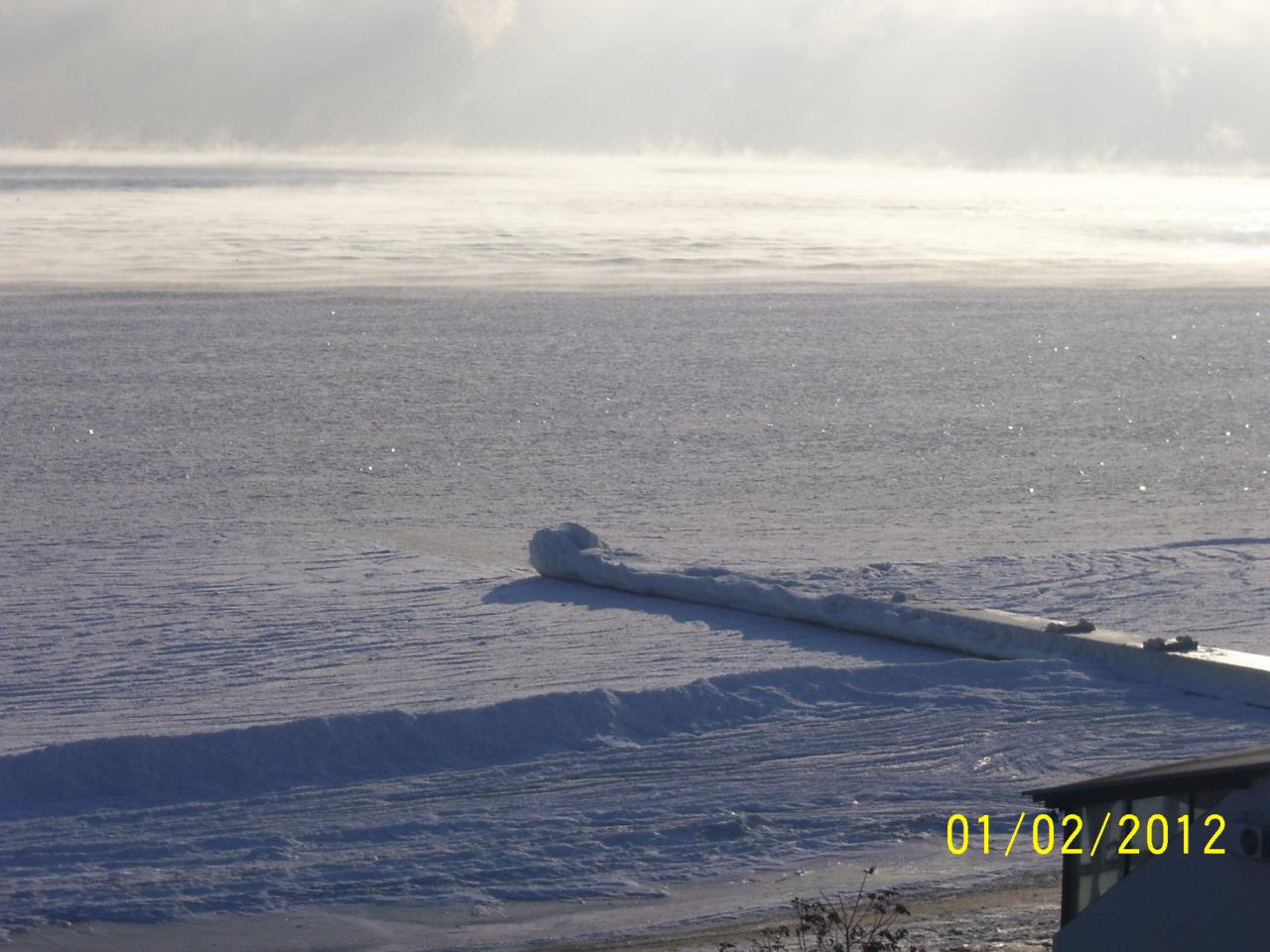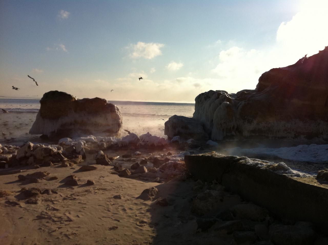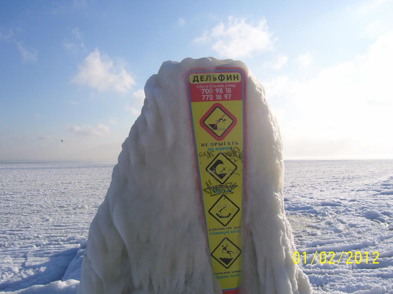 У дельфинария сегодня с утра. Море пока не замерзло, ледяная каша. Зато на пирсах и плитах пейзажи арктические.