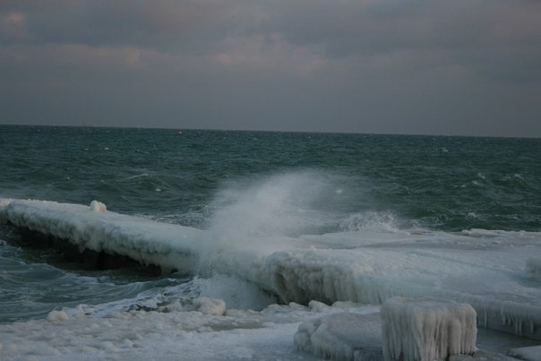 Всем доброе утро. Решил, значит, сегодня с утра прогуляться к морю, ну посмотреть там как и что, а моря там не нашел точнее - не нашел его в привычном для нас жидком состоянии. До волнорезов всё лежит сплошной ледяной плитой, за волнорезом скрипят друг о друга большие ледяные плиты.. Но, сама корка не очень толстая, ходить по ней я бы не решился, хотя, видел и таких..