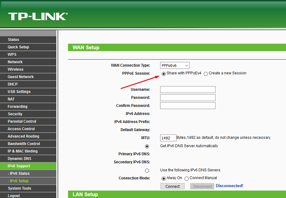 Таки да, на моём барахле с заводской прошивкой IPv6 работать не будет. Должна быть галочка PPPoE Session: Share with PPPoEv4. А у меня её нет