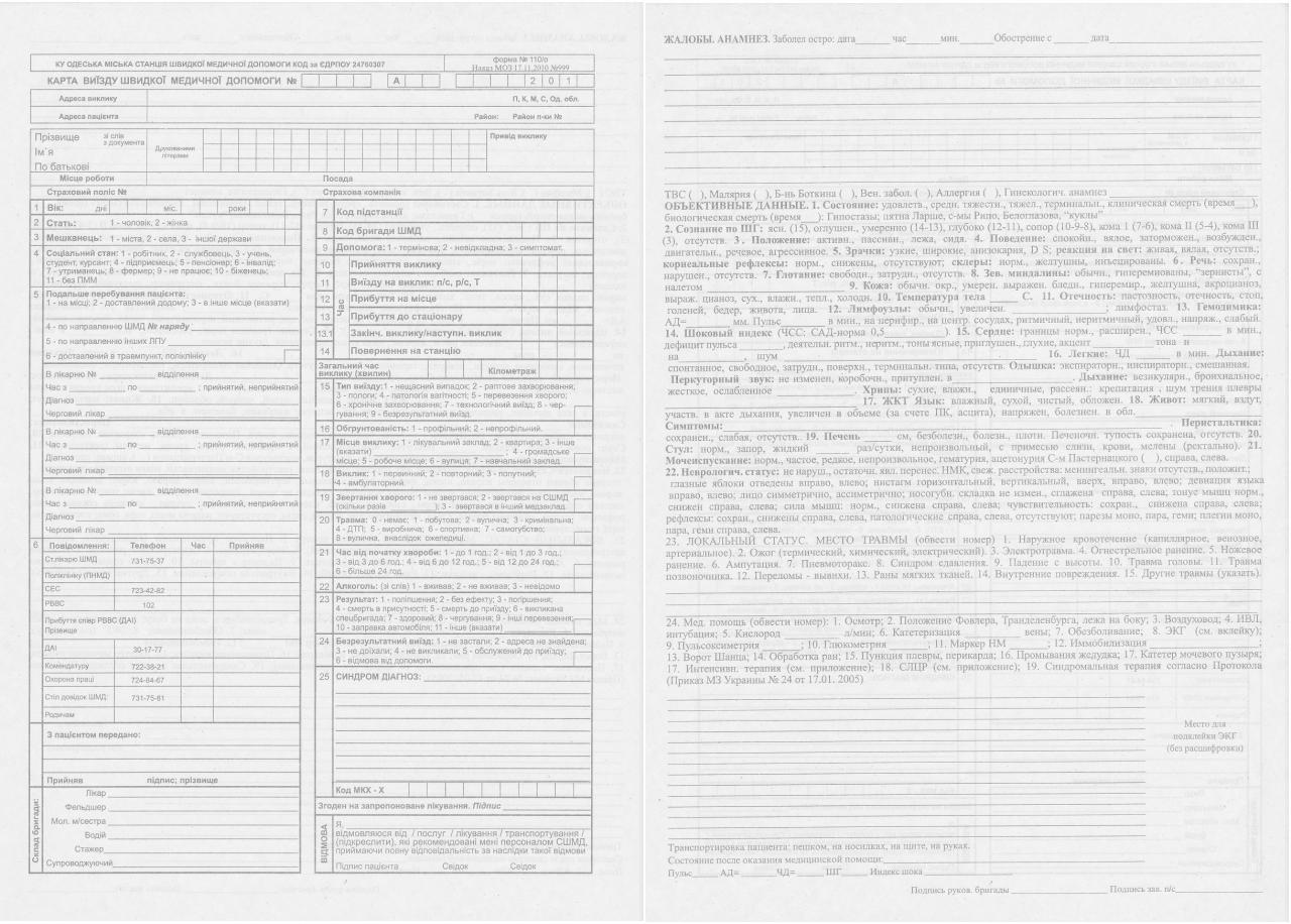 Хотя самая сложна карта вызова наверное САМУРская - 4 страницы, в неё включены такие показатели как газометрия крови, временные показатели гемодинамики (~ каждые 5 минут, для тяжелых пациентов в пути следования СМП), шкалы иннервации, травм, ожогов...