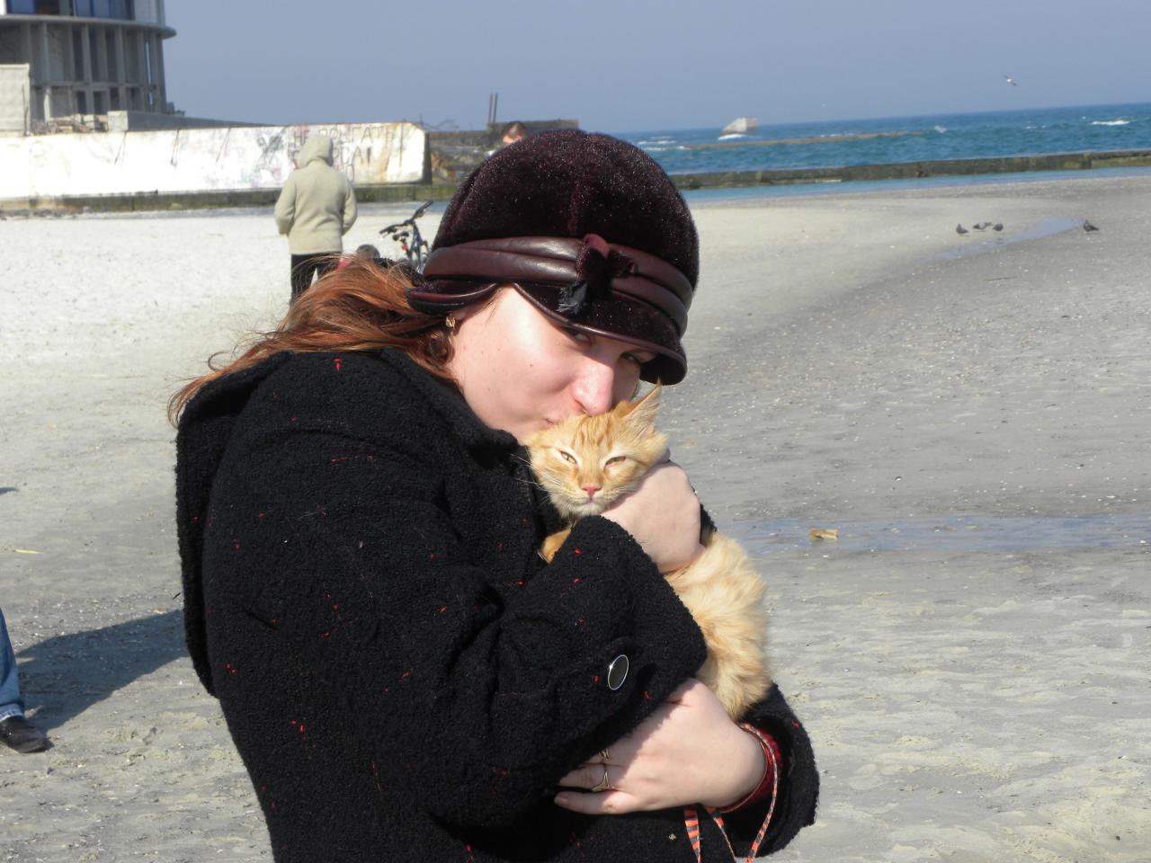 это мы на фонтане, возле "Зебры". перепугался, сначала прятался под мой плащ, потом в сам плащ попросился))) ветер и шум моря его напугал изрядно