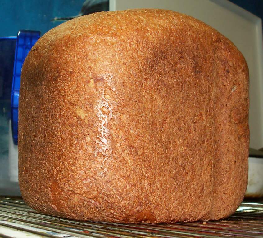 вот такой получился хлебушек с добавкой к пшеничной муки пшеничных отрубей в количестве 17 %: для большого размера XL на 500 г муки ("богумила") взяла 100 г отрубей (покупала на "Черноморском"). Для подстраховки добавила 3 ч.л. клейковины. Остальное - по рецепту "основного хлеба" панаса.