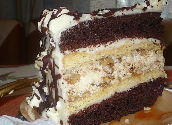 Сборка - коричневый корж - сметанный крем - белый корж белками вверх - масляный крем - белый корж белками вниз - сметанный крем – коричневый корж. Сверху залить глазурью.