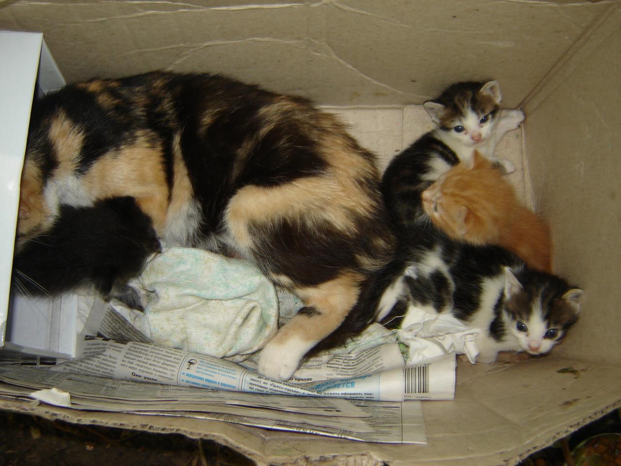 Сегодня выясняла кто так поступил с кошкой и котятами . Вроде бы вчера какая-то пожилая женщина несла эту коробку , в которой пищали котята , на вопросы отвечала , что они ей надоели . Кошка в это время гуляла на улице . В квартиру ее больше не пустили и она бегала по двору и искала котят минут 20. А котята от страха молчали и не отзывались . Слава богу , что она их нашла и больше не отходила от них. Я знаю , что кошечка домашняя , она часто приходила в гости к нам в офис .Такая ласковая , мурчащая . Вроде бы ее зовут Маня .