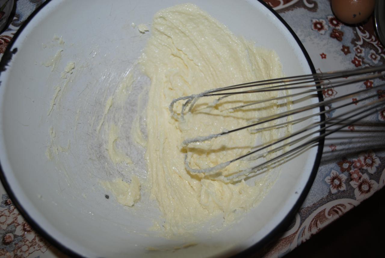 3. Сливочное масло растопила и влила в творог, туда же всыпала стакан (в данном случае чашку) сахара. Снова все это хорошо перемешала и влила пену из белков.