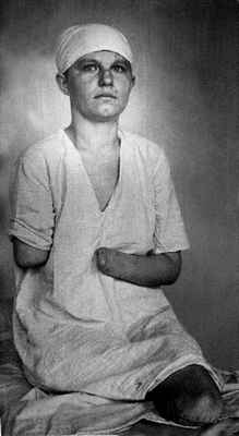 В последнем бою, когда я бросилась на помощь раненому командиру взвода, ранило и меня, перебило обе ноги. Фашисты шли в контратаку. Меня некому было подобрать. Я притворилась мертвой. Ко мне подошел фашист. Он ударил меня ногой в живот, затем стал бить прикладом по голове, по лицу... И вот я инвалид. Недавно я научилась писать. Это письмо я пишу обрубком правой руки, которая отрезана выше локтя. Мне сделали протезы, и, может быть, я научусь ходить. Если бы я хотя бы еще один раз могла взять в руки автомат, чтобы расквитаться с фашистами за кровь. За муки, за мою исковерканную жизнь!