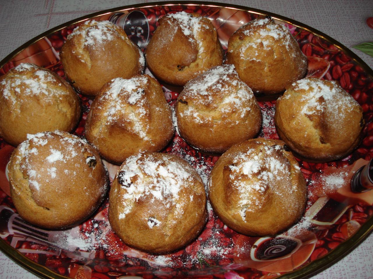 3яйца, 3стаканчика муки, 1 банка сгущенки, 1ч ложка соды, гашенная уксусом, 200г масла или маргарина (я беру коровку), изюм - по вкусу, я ложила грамм 150.Все ингредиенты смешать , я это делала в большой чаше блендера, в конце добавить изюм. Формочки смазать маслом, выложить тесто и выпекать где-то при 180 градусах 30-40 минут.