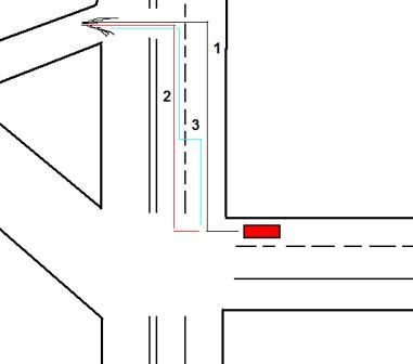 И Красный поворачивая принимает правую полосу, а потом проситься в левый ряд до перекрестка.
