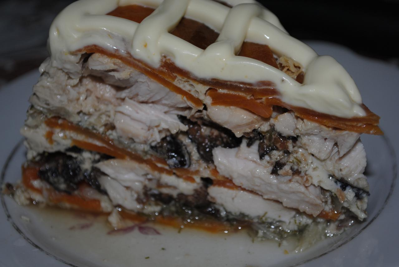 Готовила запеканку куриную с овощами. Слой морковки с луком жаренные, притрушенные укропом, слой предварительно промаринованного в соевом соусе +горчице + мёде филе, слой чернослива кусочками; всё это два раза; сверху слой уже сырой морковки (не хватило жаренной), всё залила смесью яиц и молока, каждый слой присолила, поперчила. Перед укладыванием слоёв выстлала кастрюльку разрезанным рукавом для выпечки. Готовила 65 мин на выпечке. Остудила в кастрюльке. Запеканка хорошо держится. Но в следующий раз слои пересыплю желатином, чтобы бульончик не убегал..