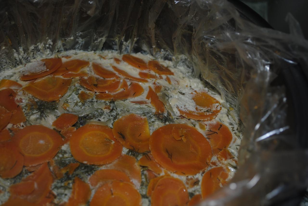 Готовила запеканку куриную с овощами. Слой морковки с луком жаренные, притрушенные укропом, слой предварительно промаринованного в соевом соусе +горчице + мёде филе, слой чернослива кусочками; всё это два раза; сверху слой уже сырой морковки (не хватило жаренной), всё залила смесью яиц и молока, каждый слой присолила, поперчила. Перед укладыванием слоёв выстлала кастрюльку разрезанным рукавом для выпечки. Готовила 65 мин на выпечке. Остудила в кастрюльке. Запеканка хорошо держится. Но в следующий раз слои пересыплю желатином, чтобы бульончик не убегал..