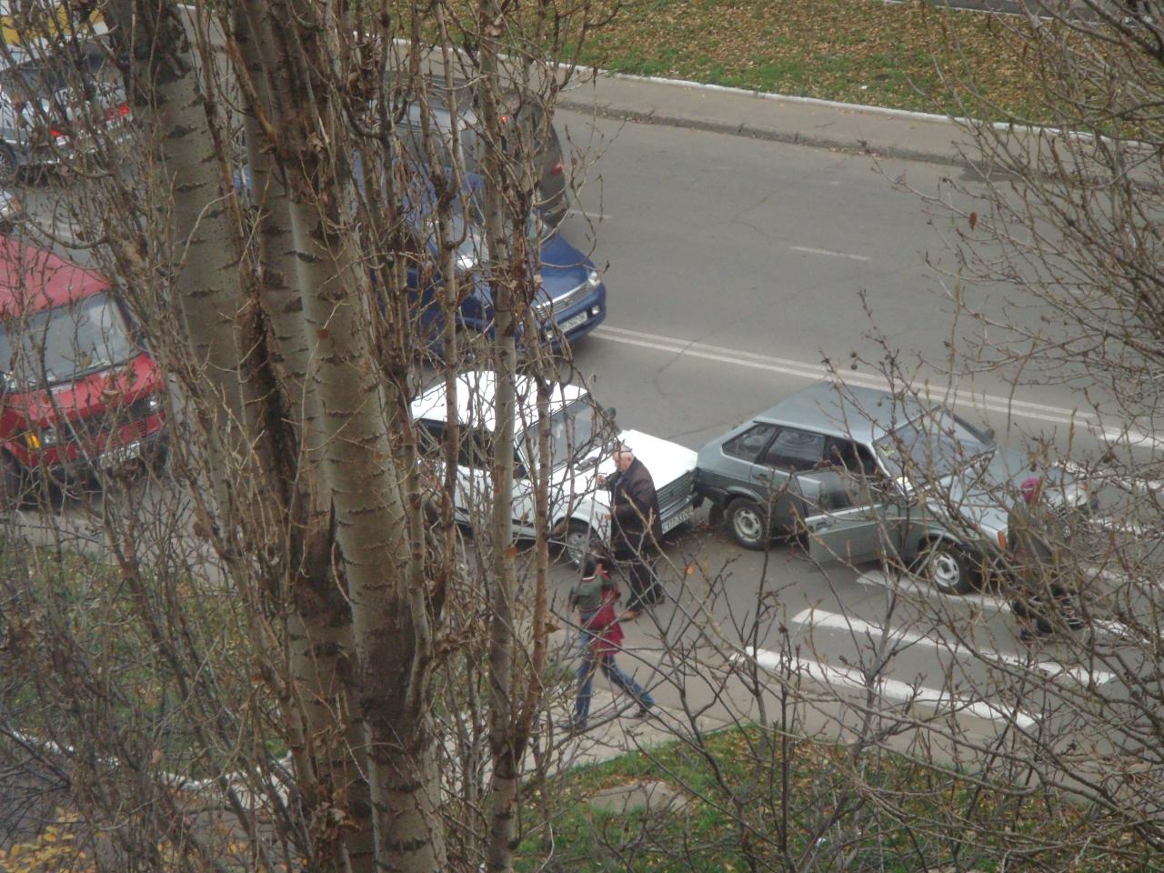 Там ещё была CAPTIVA, которая немножко догнала бирюзовую (шкоду), а её притёр тягач с краном. Но CAPTIVA пострадала больше. Днём только стукнулись. Телевидении было.