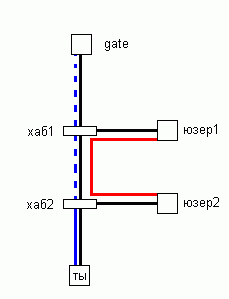 Например, юзер1 качает с юзер2 на скорости 100 мб/с через 100мбитный хаб(ы). Если ты находишься относительно гейта ЗА таким хабом (хабами) - то могут быть проблемы. Раз уж у вас в сети все общаются в каком-то локальном чате - уточни этот момент (уточни у кого какие скорости стоят на сетевых платах).