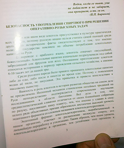 Книга, в частности, рассказывает, как оперативникам оставаться в сознании при застолье, не сболтнуть тайну, быстро трезветь и лечиться от похмелья. "Водка, когда ее пьют, ума не добавляет и не забирает, она проверяет, есть ли он", – пишет автор. Опохмеляться он советует теми же напитками, которые были "вкушены накануне".
