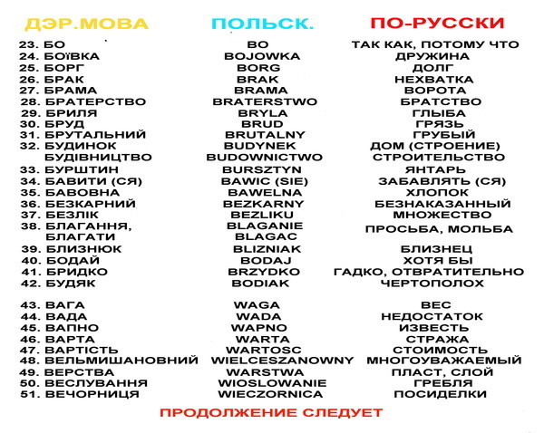 Ті, хто таке складає самі настільки неосвічені, що навіть у цьому коротесенькому переліку, де спеціально підібрані однакові українські та польскі слова (а не однакові російські та татарські, чи фіно-угорські) себе ж підставляють.