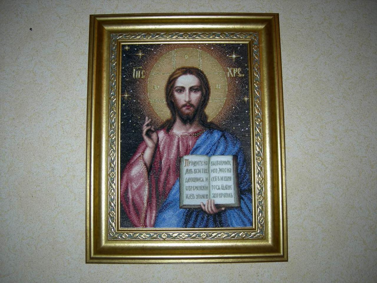 Работа выполнена на ткани Хардангер двумя техниками, фон и ризы - большой счётный крест, лики - маленький крест.