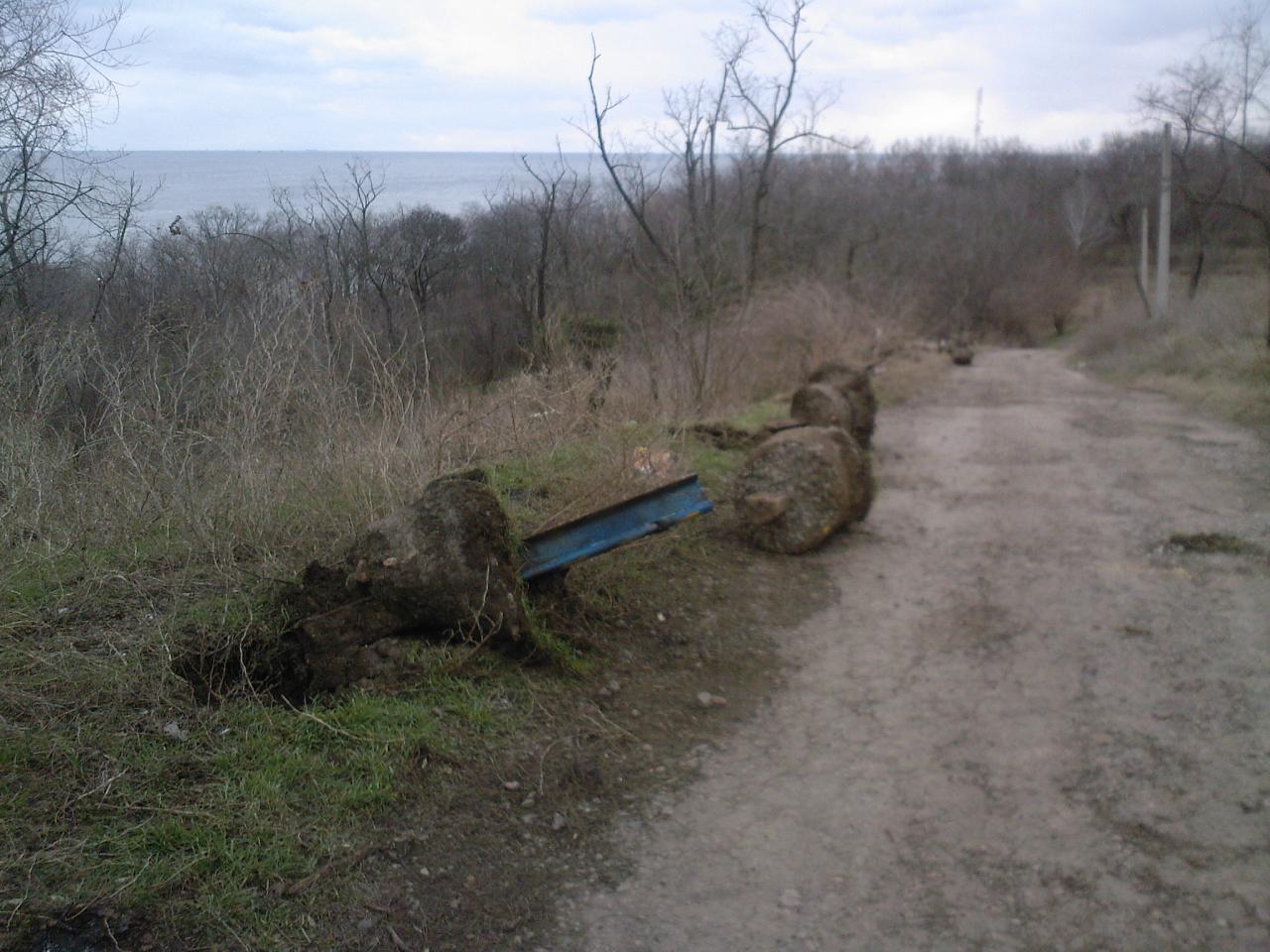 Итак, побывав на спуске к Ланжерону, любой желающий может насладиться дивным зрелищем. Там, где еще недавно раздолбаная дорога к автокинотеатру была огорожена врытыми и забетонированными рельсами с натянутым между ними тросом в руку толщиной, ныне живописными кучами валяется бетон, вырытый (!) и разбитый (!), рельсы исчезли, как и трос, у которого чудесным образом выросли ноги. Пройдя по дороге вниз, можно увидеть еще не разбитые бетонные глыбы с рельсами, но уже вырытые, и, видимо, ожидающие своего часа. Не представляю себе, каким трактором их выдергивали, а также какой головой разбивали, но, видно кому-то это добро уж очень понравилось. Даже деревья в процессе сломали.Продана прибрежная зона? – Ха! Одесситов этим не удивить.