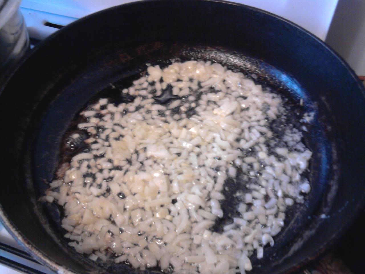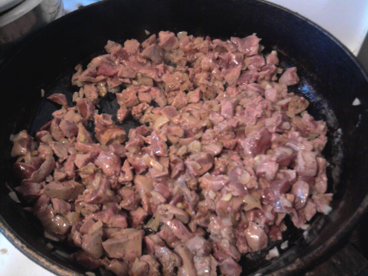 Первым делом отправляем к мясу лук и перепелиные потрошки, найденные в тушках.