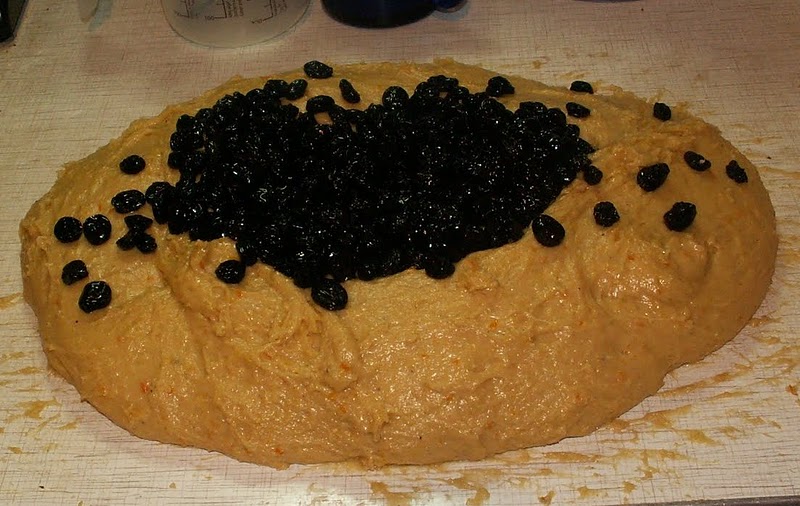 Отдельно смешала 4 яйца, 150 г сахара (измельченного в миксере с цедрой лимона и 3/4 апельсина), 400 г муки и 15 г соль ( технология внесения продуктов по ссылке: яйцо сначала смешивается с сахаром, добавляется соль и небольшое количество муки, все вымешивается снова, пока все ингридиенты не смешались). Получившееся тесто смешала с тестом четвёртого замеса. Обязательно хорошо вымесить тесто, до отлипания от рук.