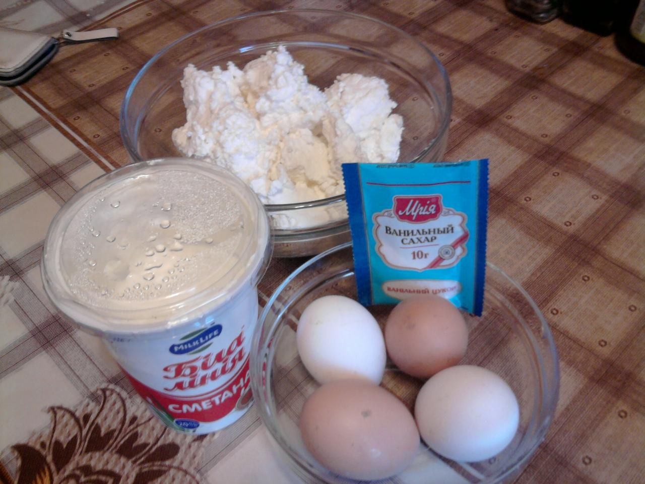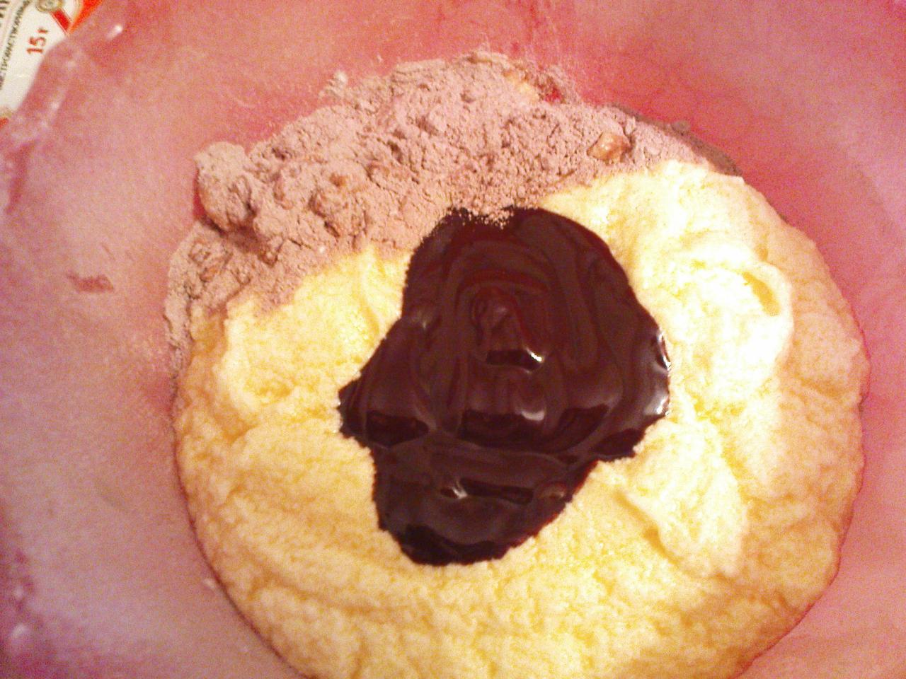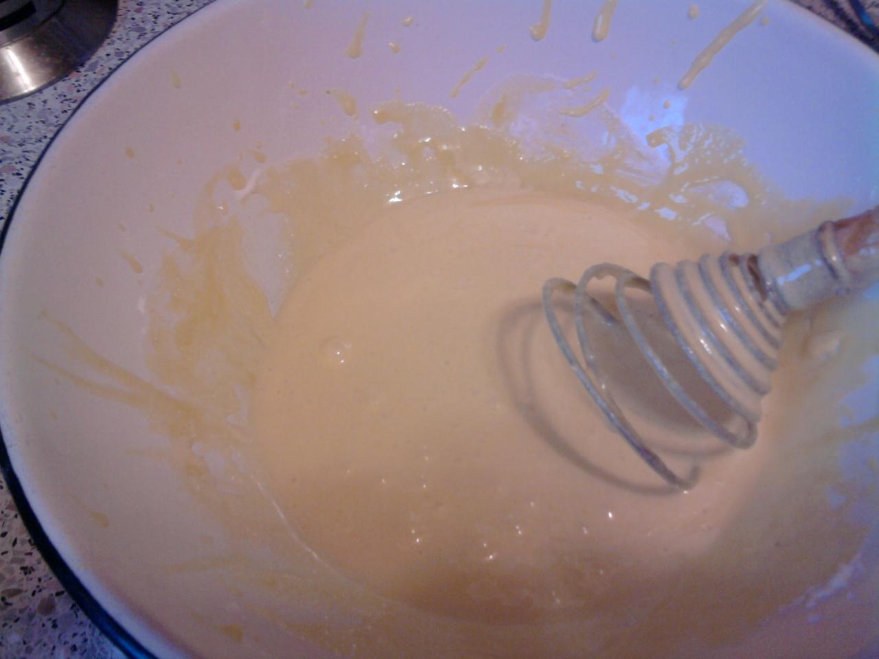 3 желтка, 150 г сахара, ваниль и 100 г муки. Хорошо вымешиваем, пока не начнёт образовываться тесто.